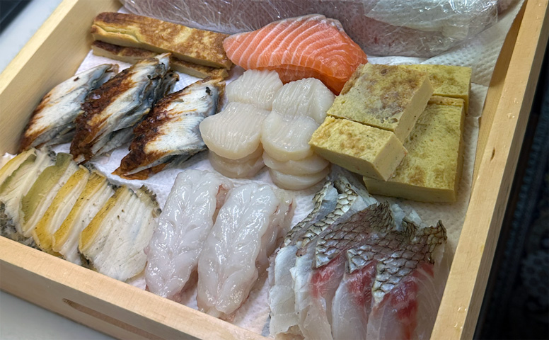 本鮪赤身 / 本鮪中トロ / トロタク / 鰻 / 生海老 / アオリイカ / 鯛 / いくら / カニほぐし身
